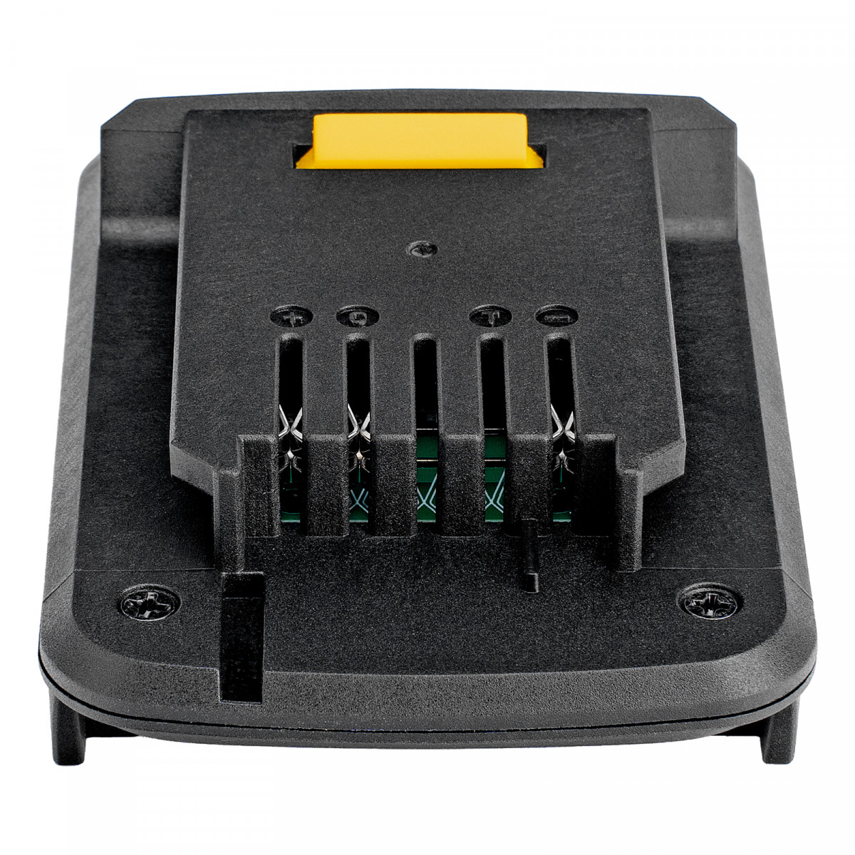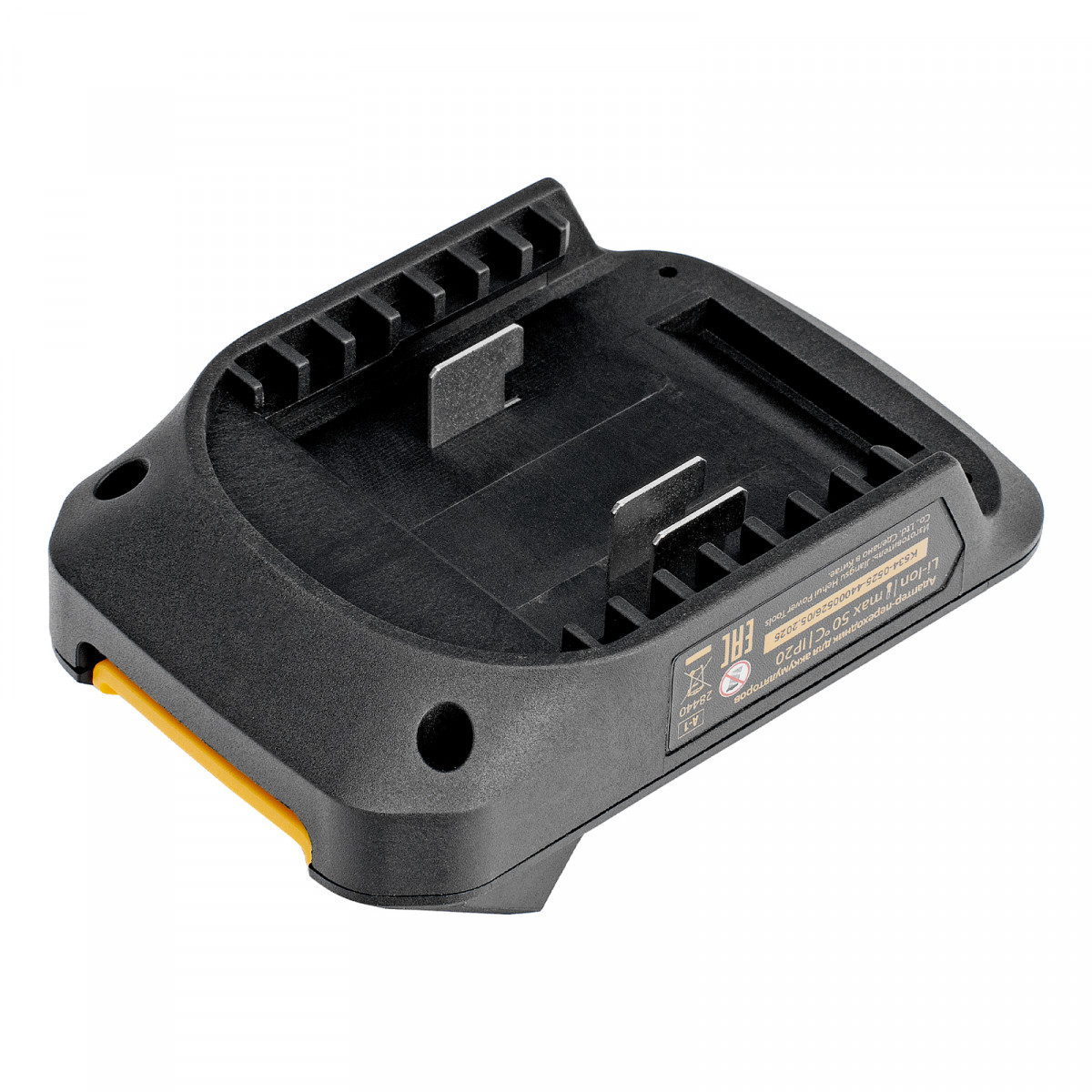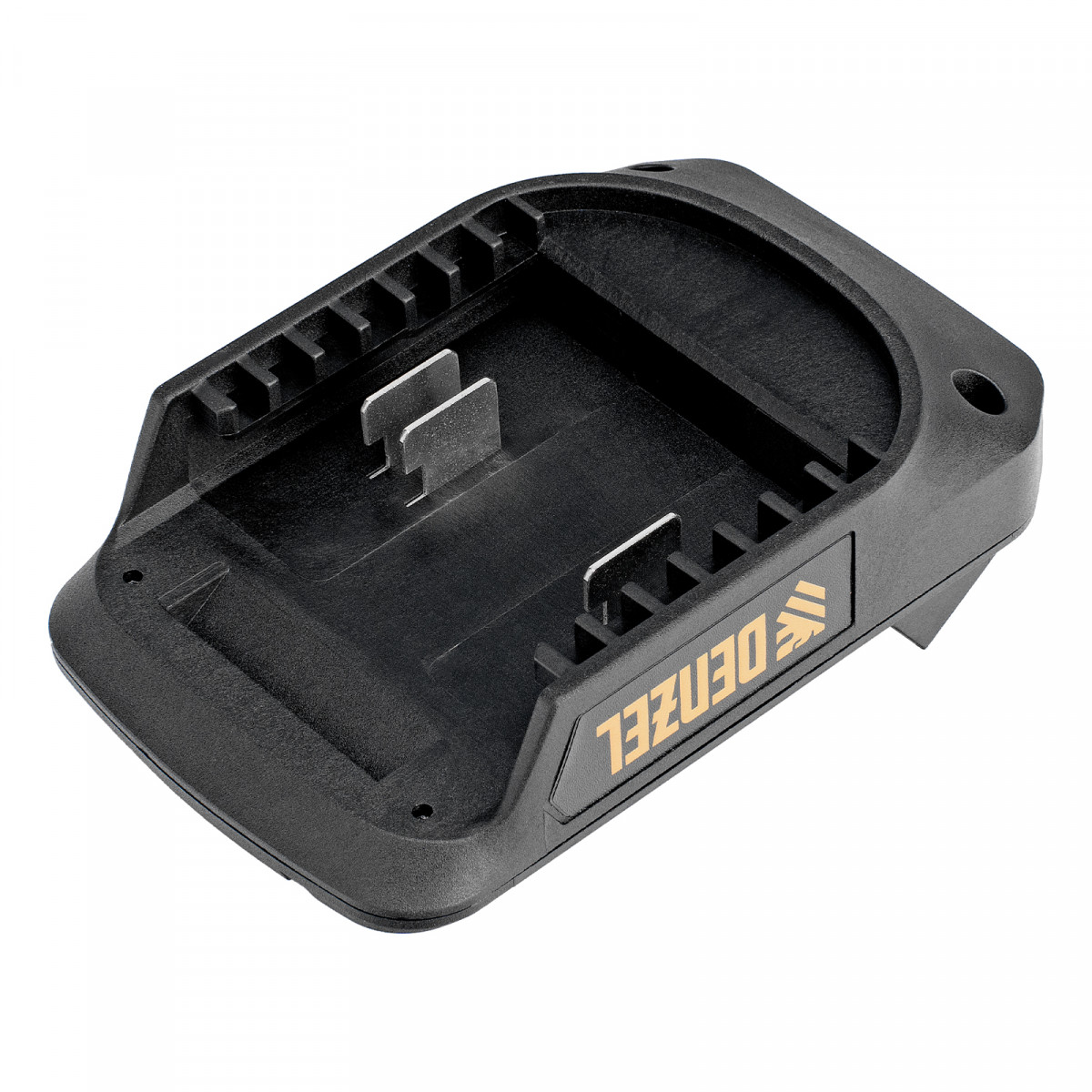 - Простое использование — достаточно присоединить верхнюю часть адаптера к инструменту или зарядному устройству платформы Denzel Power System 18 V, а на нижнюю часть установить аккумулятор Denzel 20 V.