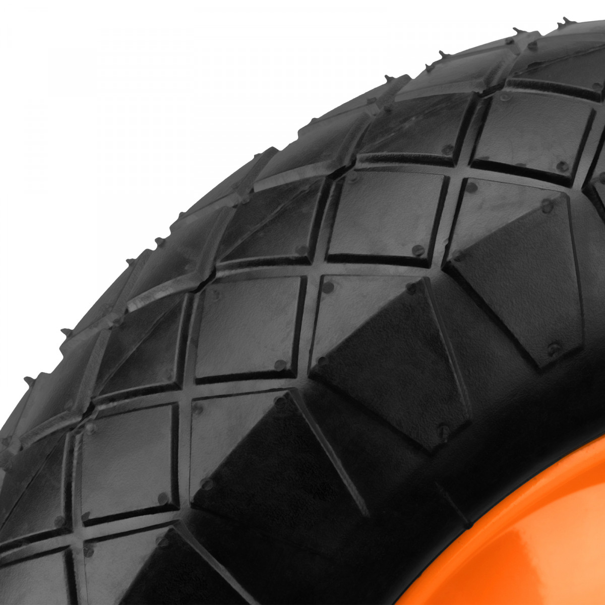 - Комфортная работа — пневматическое колесо эффективно поглощает вибрации даже при полной загрузке тачки.