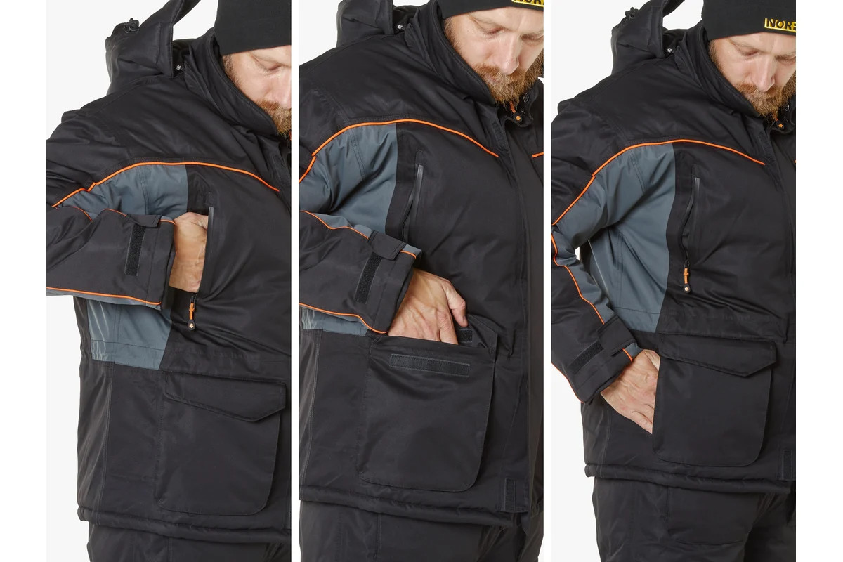 Куртка оснащена двухзамковой застежкой-молнией с клапаном на «липучке», капюшоном с козырьком и двухуровневой регулировкой, высоким воротником с флисовой подкладкой, внутренними эластичными и наружными регулируемыми манжетами на рукавах, утепленными внутренними и удобными наружными карманами. Есть возможность регулировки объема куртки в области талии. Для безопасности предусмотрены светоотражающие элементы.