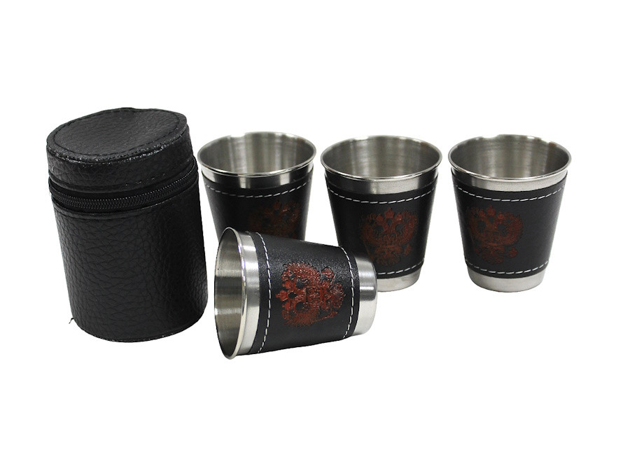 Набор стопок 75 мл (герб на коже) состоит из четырех стопок в кожаном чехле.