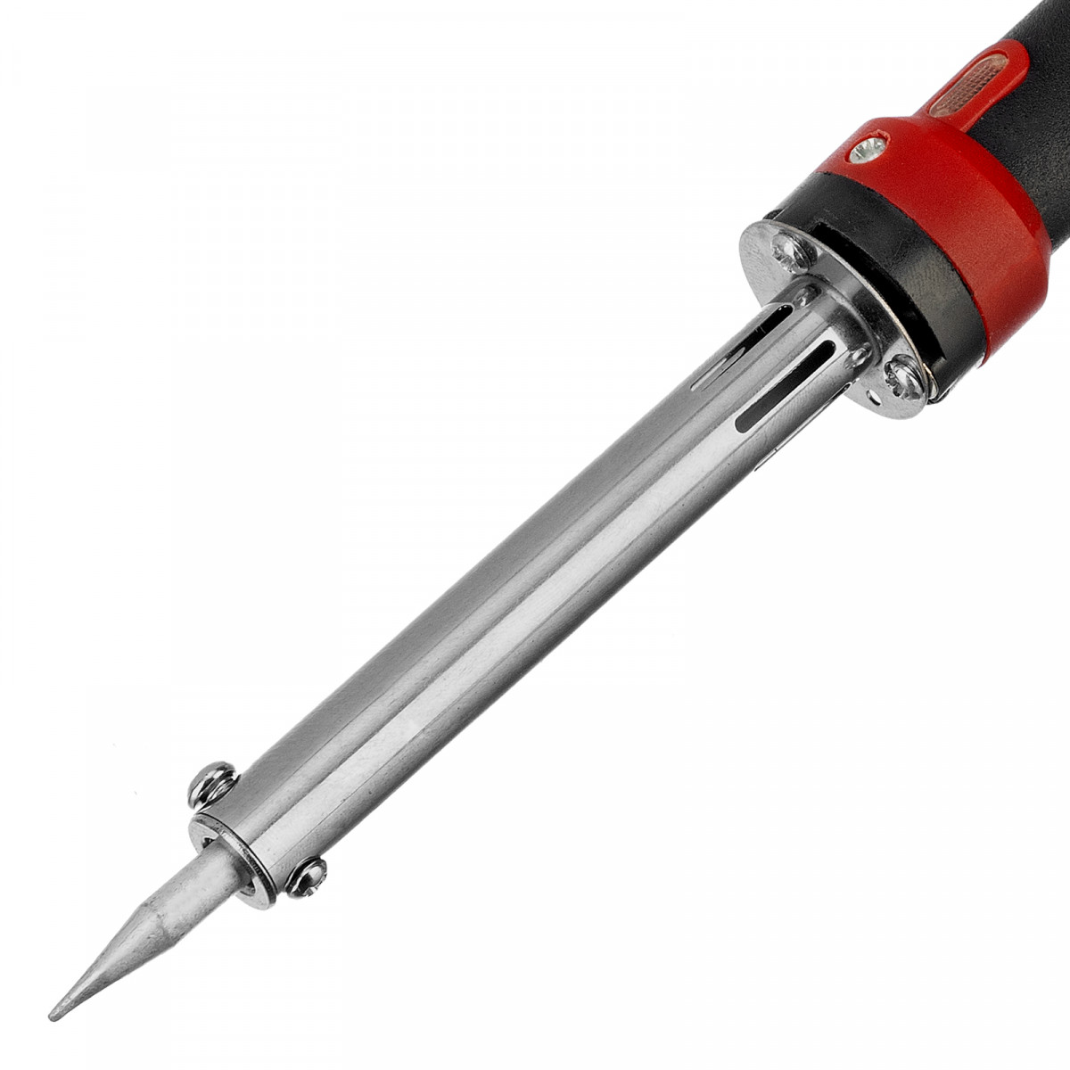 - Продолжительная работа с паяльником не вызывает усталость благодаря удобной пластиковой рукоятке с мягкой накладкой.