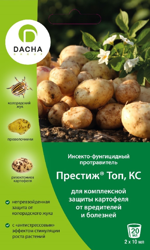 Препаративная форма: концентрат эмульсии.Высокоэффективный препарат для борьбы с вредителями, поражающими, в основном, картофель. Это средство не только уничтожает насекомых, но и излечивает ряд болезней, а также оказывает сильное антистрессовое действие. Чаще всего Престиж используют для опрыскивания клубней картофеля перед высаживанием в почву. Период действия – на протяжении всей вегетации и вплоть до окончания цветения картофеля.Норма расхода: 10 мл препарата на 100 мл воды на 10 кг клубней картофеля.