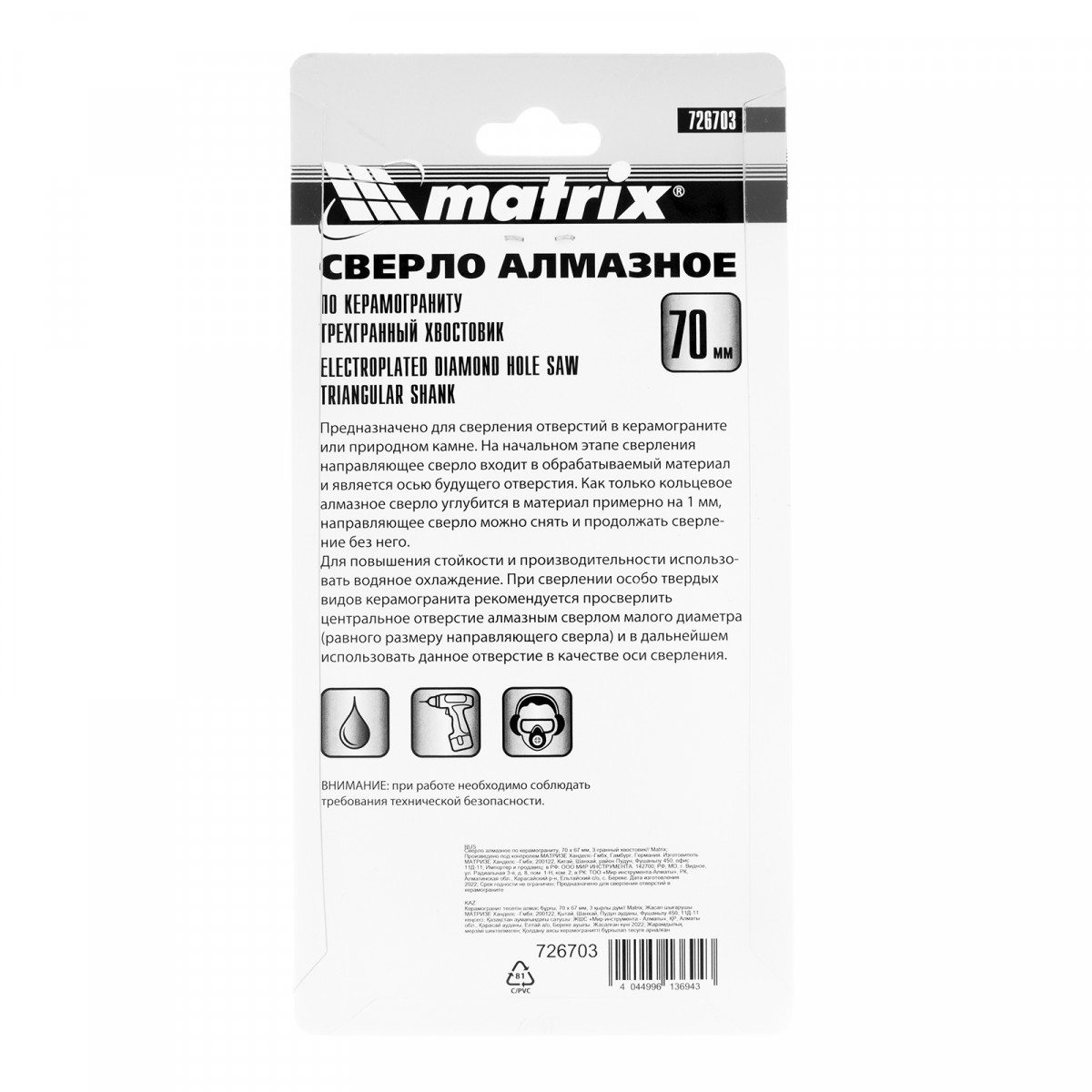 Сверло алмазное по керамограниту, 70 х 67 мм, трехгранный хвостовик Matrix