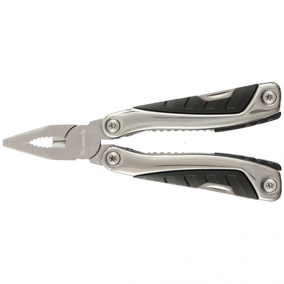 Трансформер Matrix 17623 длиной 160 мм имеет 15 функций и авторазжим, поставляется с чехлом. Может использоваться в гараже, т.к. включает длинногубцы с кусачками и захватом полукруглых предметов, а также отвертки и линейку. Трансформер пригодится в походе, на рыбалке или охоте, поскольку имеет в составе нож, пилу, открывалку, консервный нож, инструменты для чистки рыбы и удаления крючка. Благодаря пилке для ногтей мультитул будет полезен в быту.